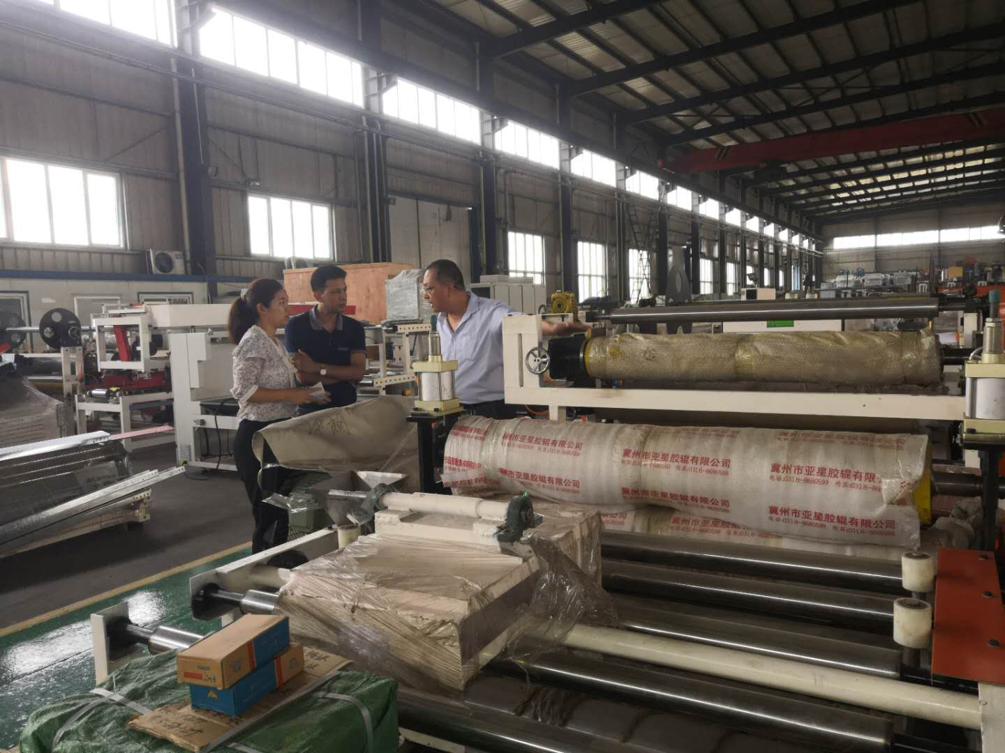 欢迎尼泊尔客户来我公司了解石膏板覆膜机!