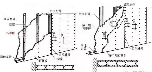 纸面石膏板墙一般由石膏板与轻钢龙骨构成,如果两侧用单层石膏板组成的墙体,则称为双层石膏板墙;如果一侧用两层石膏板,另一侧为用一层石膏板组成的墙体,则称为三层石膏板墙;如果两侧均为用两层石膏板组成的墙体,则称为四层石膏板墙。