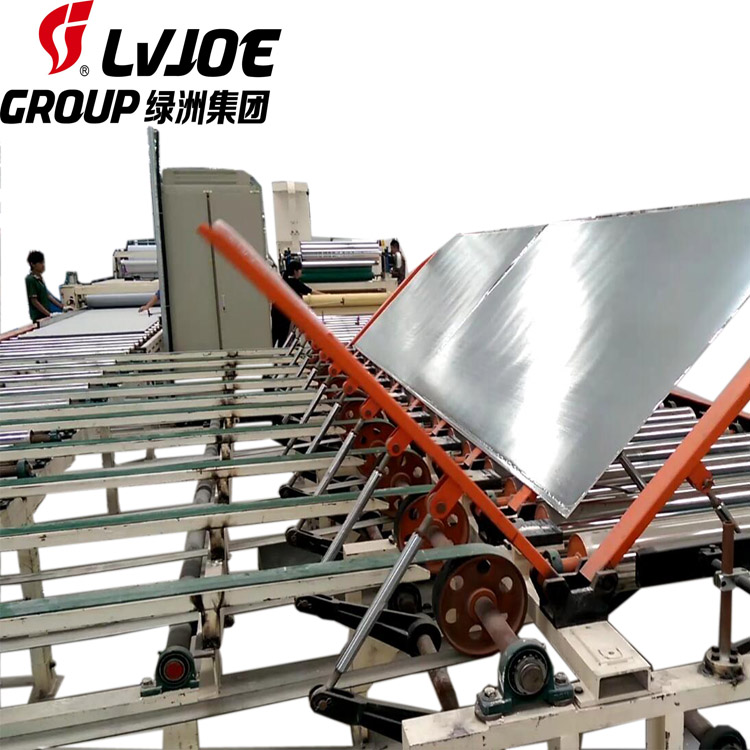 本机是通过自动上板装置(自动上班方式可选:1推板式,2吸板式)使装饰薄膜与板材粘贴在一起的覆膜机,整机变频调速控制。首先,将覆板材放在输送辊上通过除尘后,将粘合胶涂布在被覆板材上,经过导辊输送使粘合剂定性后与薄膜合并进入复合机构,经过三道压辊的反复辗压完成复合工序。再进入自动翻板机翻板输送进入下一道覆合工序最终进入下板装置堆放完成生产
