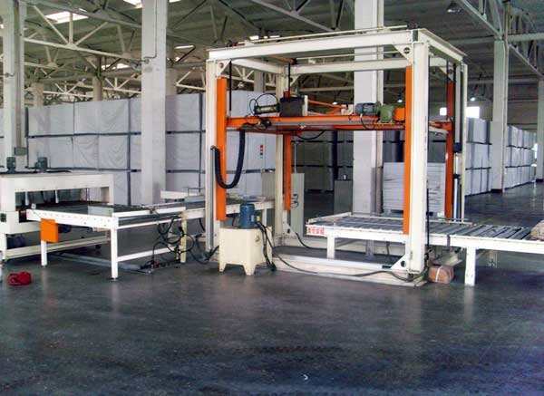 自动堆垛机:采用液压升降系统实现堆栈的上下运动,高精度传感器实现升降系统精确定位。每层堆放4包、最高可堆放10层。