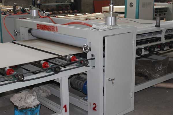 覆膜部分有三次压合部分,每一次压合部分配有上下两根橡胶辊进行压合覆膜,上压合橡胶辊采用气缸控制上下运动,工作压力为4KG 。功率2.2KW