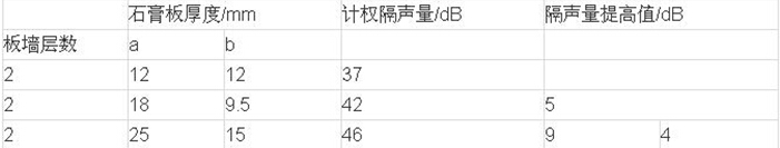 两侧用单层石膏板与75mm×50mm的C型轻钢龙骨组成的双层石膏板墙,板厚12mm与12mm、9.5mm与18mm、15mm与25mm组成的三种墙体的厚度分别为99mm、102.5mm和115mm,板墙中未填充吸声材料时其计权隔声量分别为37dB、42dB和46dB。从这些数据中可以看到板墙中石膏板厚度的加大使隔声量有较大的提高,三种不同板厚墙体构造及隔声量的比较见下表: